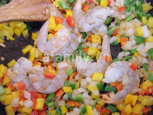 Cho ớt chuông đã cắt vào đảo sơ rồi thêm tôm vào. |